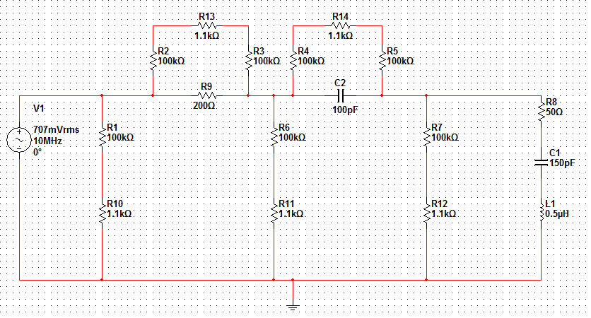 W miejscu wszystkich rezystorów 1.1k wyobraźcie sobie wejście AD8307 (ich rezystancja wejściowa różnicowa, to właśnie 1.1k - na razie pomijam zadeklarowany przez producenta równoległy 1.4pF).