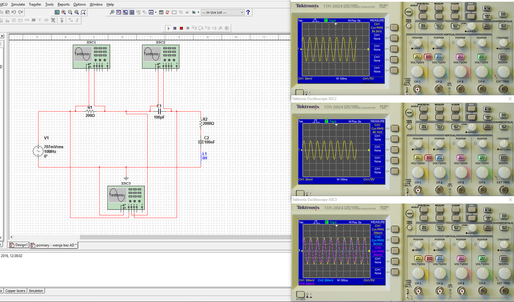 Otóż przeprowadziłem symulację sieci pomiarowej z pomiarem napięć bezpośrednio przez wirtualne oscyloskopy. Coś jak tutaj: