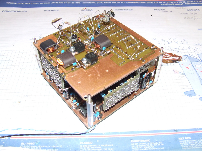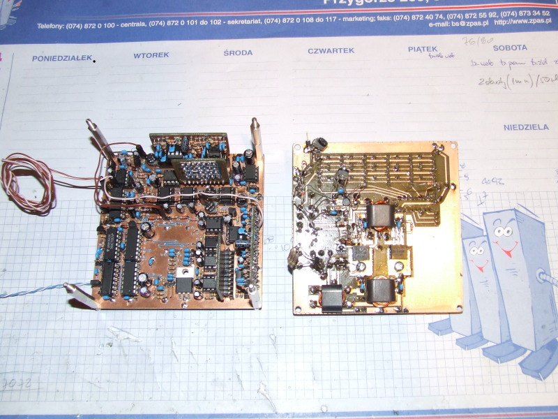 Mam pierwsze pytanie o płytki więc obiecuję, że w ciągu kilku dni przedstawię dokładniejszą informację na ten temat. Płytki do DDS-a można już zamówić w pewnej firmie w Poznaniu, która zrobiła mi kilka sztuk na zlot w Burzeninie więc jak tylko dostanę odpowiedź to podam dane firmy oraz przybliżony koszt kompletu. Jeśli chodzi o opis konstrukcji to prawdopodobnie w ciągu kilku dni zamieszczę schemat z pomiarami napięć w węzłowych i istotnych punktach układu oraz kilka obrazów z oscyloskopu. Postaram sie również zdjąć charakterystyki przenoszenia filtrów m.cz. oraz zmierzyć czułość a jak się uda również tłumienie drugiej wstęgi. Ponieważ jednak mam do dyspozycji jedynie prosty oscyloskop i miernik uniwersalny to zajmie mi to trochę czasu ale przede wszystkim muszę wymyśleć jakąś rzetelną metodę pomiarową. Chętnie usłyszę propozycje jak to zrobić aby je skonfrontować z własnymi pomysłami i dopasować do posiadanych warunków ;-)