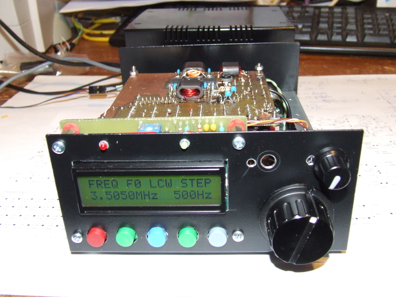 Na początek załączam schemat układu oraz kilka zdjęć przedstawiających jak powstawało urządzenie. Jak pisałem urządzenie już działa, odbiornik pracuje od 0 do 16MHz a nadajnik sprawdzałem pracując na 3.5 emisją cw wykonując kilkadziesiąt łączności z krajami całej Europy oraz emisją ssb z kilkoma kolegami z Polski. Logika zawarta w układzie DDS zapewnia za pomocą 5 klawiszy ustawienie częstotliwości wzorca DDS-a, przełączenie trybu pracy CW/SSB, przełączenie wstęgi USB/LSB, wybór jednego z VFO (F0 lub F1) zrównanie częstotliwości obu VFO (Fx=Fy) oraz ustawienie kroku przestrajania w zamkniętym cyklu 5Hz-> 50Hz-> 500Hz-> 5kHz-> 50kHz-> 500kHz-> 5Hz->50Hz.... Poza tym układ DDS steruje automatycznym przełączeniem oktawowych filtrów pasmowych w.cz. przy czym częstotliwości obu VFO mogą oczywiście leżeć w całym paśmie 0-16MHz.