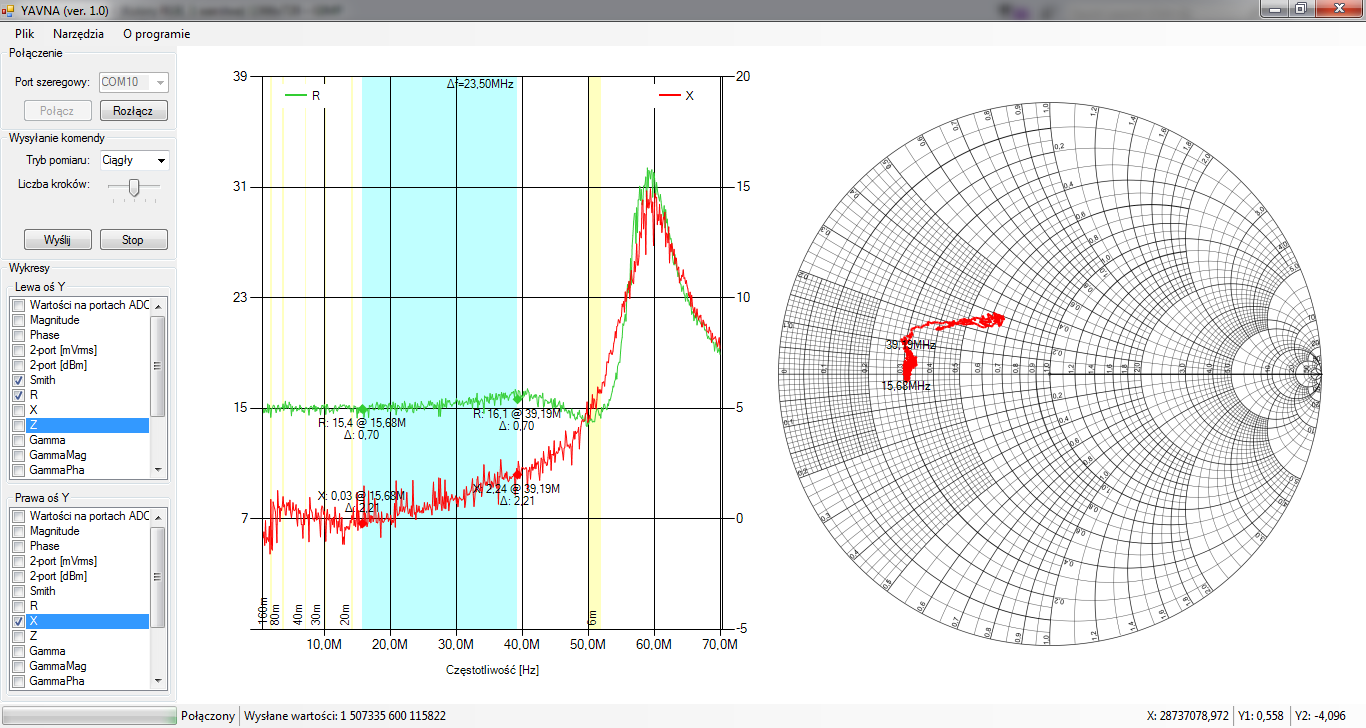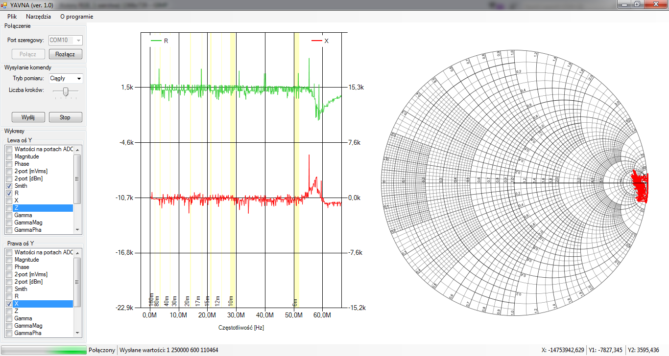 Tłumienie w ramieniu fali odbitej to ponad 60dB dla częstotliowści ponad 7.5MHz (ponad 50dB od częstotliwości 4MHz). Pełny zakres pomiarowy to 1-30MHz. Wydaje się więc, że na rdzeniu dwuotworowym można zrobić sprzęgacz w zakresie 1-30MHz o kierunkowości ok. 40dB dobierając nieco inny materiał na rdzen poprawiający własności sprzęgacza od dołu.