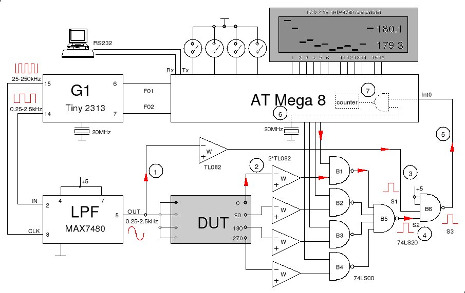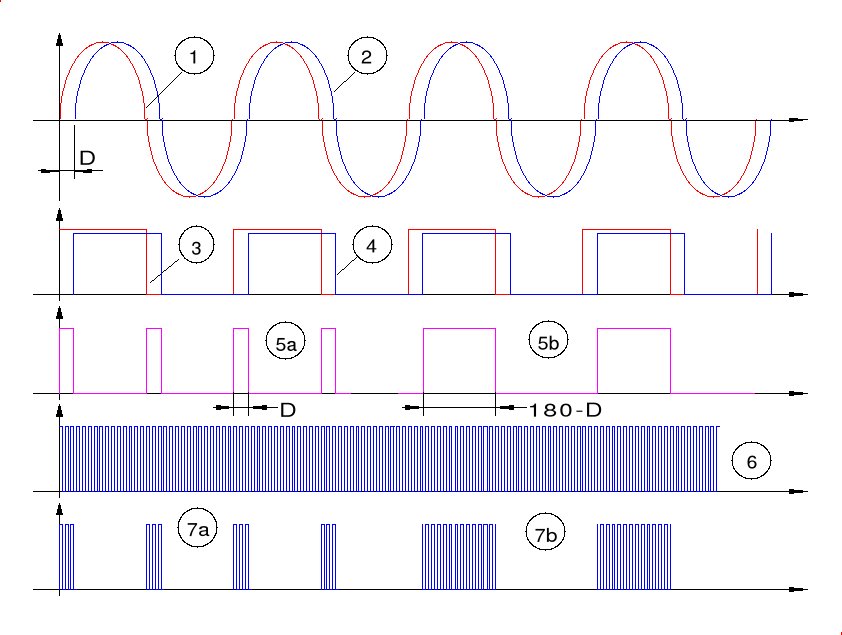 Sposób pomiaru fazy jaki zamierzam wykorzystać pokazuje załączony rysunek. Zakładając, że sygnał 1 działa na wejściu toru a sygnał 2 pojawia się na wyjściu toru wtedy przesunięcie fazy jest proporcjonalne do czasu D na tym rysunku. Pomiar przesunięcia fazy można zatem sprowadzić do pomiaru odcinka czasu, który z kolei wykonuje się z reguły jako pomiar ilości impulsów jakie w czasie tego odcinka czasu uda się przepuścić przez bramkę pomiarową. Przedtem jednak należy mierzone sygnały znormalizować (np. przez bardzo duże wzmocnienie) aby uniezależnić pomiar od amplitudy mierzonego sygnału. Po normalizacji sygnały mają postać 3 i 4 i nadają się do cyfrowego określenia odcinka czasu D przez wykonanie sumy XOR na sygnałach 3 i 4 (funkcja XOR ma wartość 1 wtedy kiedy oba porównywane sygnały są różne). Jeśli jednak przesunięcie czasu będzie niewielkie to odcinek czasu D (5a) będzie bardzo mały. Można jednak użyć dla sygnałów 3 i 4 funkcji AND tworząc impuls równy 180-D (5b), który będzie znacznie dłuższy. Obie metody są sobie równoważne jeśli chodzi o dokładność ale ze względów praktycznych metoda 180-D daje więcej czasu na analizę pomiaru z użyciem mikrokontrolera. W rezultacie dla czasu 5a uzyskamy ze żródła 6 impulsy pokazane jako 7a a dla czasu 5b impulsy pokazane jako 7b.