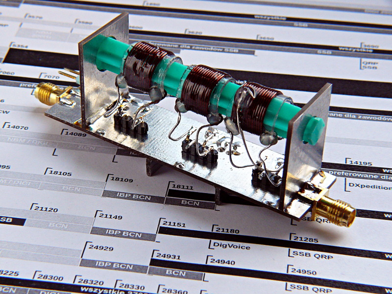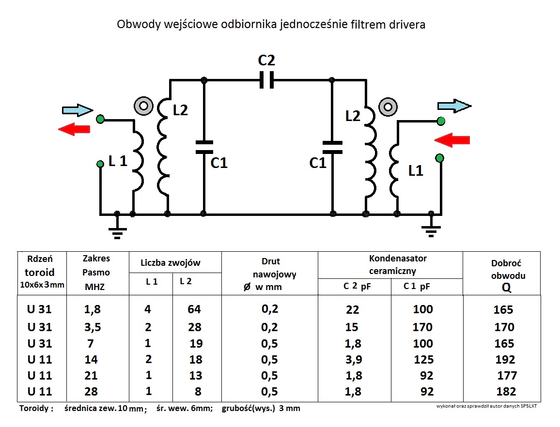 Prezentowany przeze mnie filtr nie jest czymś nowym, jest on powszechnie znanym filtrem. Wykonany został na rdzeniach toroidalnych U31 i U11, rdzenie F82 wbrew potocznej opinii nie sprawdzają się w pasmach KF, wykonane na nich obwody daleko odbiegały od moich oczekiwań. Rdzenie U31 dobrze pracują od 1,5 MHZ do 10 MHZ, ale dla 10 MHZ lepiej zastosować U11, który doskonale pracuje od 10 MHZ do 30 MHZ i wyżej . Na U31 i U11 uzyskiwałem największe dobroci opisane szczegółowo w pliku PDF niżej, badając je miernikiem dobroci Q, tak zwanym Qmetrem pracującym w czasie pomiaru na częstotliwości badanego obwodu. Wyniki L i C zawarte są w tabeli. Niu umieściłem płytki PCB uznając to za zbędne ponieważ każdy ma swoje rozwiązania techniczne, moje wyniki mogą posłużyć jako podstawa do własnego wykonania. Nawijając zwoje na rdzeń należy je dokładnie ułożyć by przewód na całej swojej długości przylegał do rdzenia, to bardzo ważne gdyż wpływa to na sprawność i dobroć układu. Zwróć uwagę na wykonanie nawet przez renomowane firmy, wykonują niechlujnie obwody na toroidach, przewód jest ładnie nawinięty, a szczelina między zwojem a rdzeniem jest widoczna gołym okiem. Należy pamiętać o pojemnościach własnych montażu by po wykonaniu dokonać drobnych korekt pojemności. Gotowy filtr można sprawdzić, mając odbiornik pracujący w paśmie tego filtra, podłączyć między antenę a wejście antenowe odbiornika, wówczas będzie widoczna różnica w odbiorze tła z eteru lub sygnału odbieranego który może być nieznacznie osłabiony, ale stosunek szumu do sygnału może być wyraźnie lepszy, dotyczy to do dokładnego wykonania filtra.