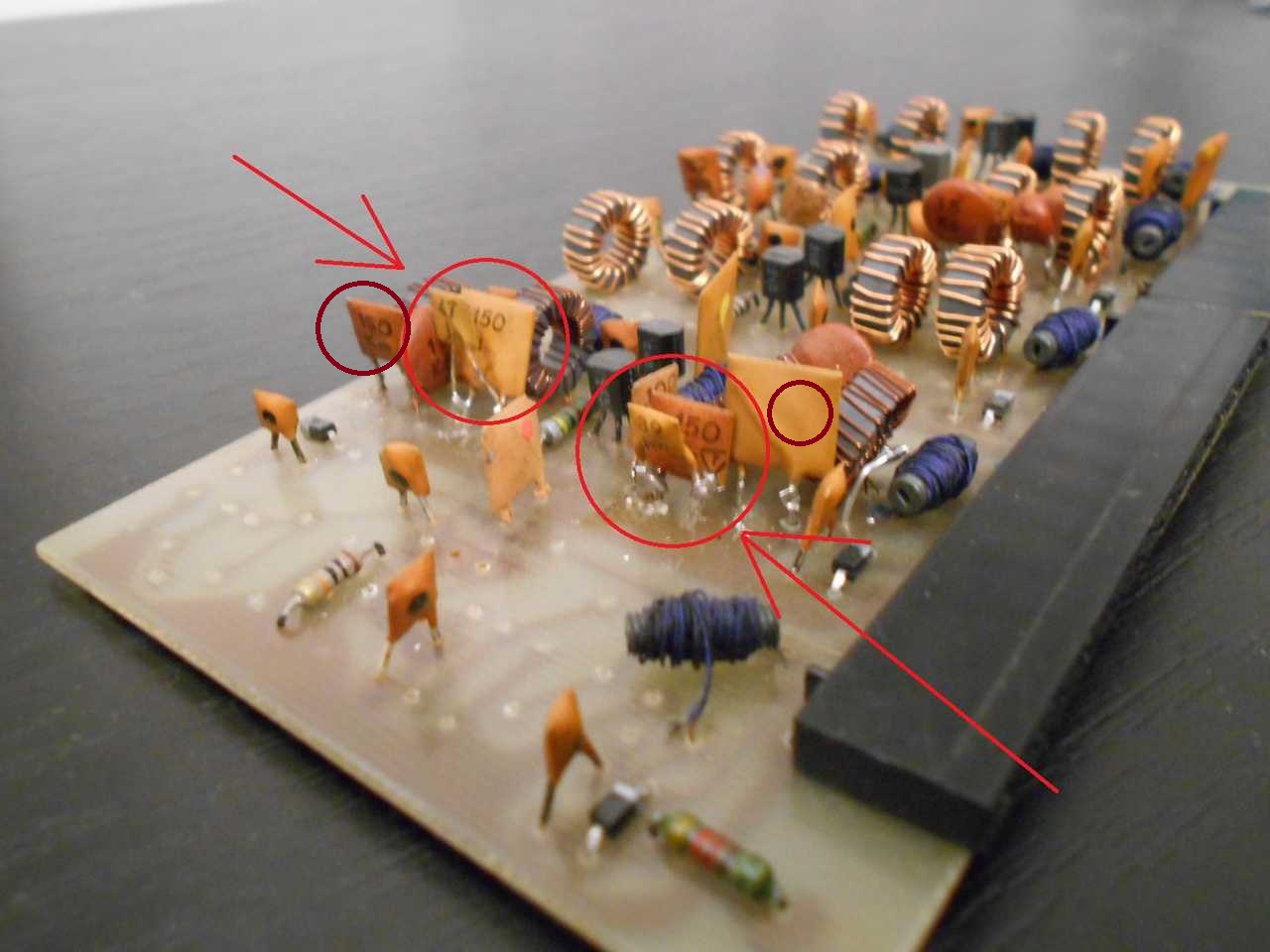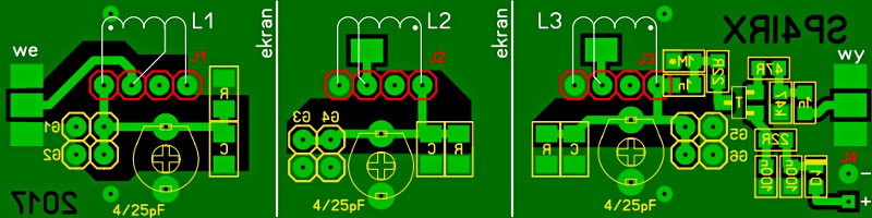 Tak, przepraszam rzeczywiście zamienione miejscami, nie mogłem załapać o co chodzi, a to takie proste, dziękuję za wyłapanie mojego błędu, poprawiłem jest poniżej, nawet radio rozkręciłem hihi, w moim transceiverze są z niewielką różnicą dla C1 i to w dodatku na większe pojemności. Załączyłem foto z zaznaczeniem w czerwonym kole tych pojemności. Inne pojemności rezonansowe C1 też są zbliżone do opisu . To pracuje, tak mam. Na zdjęciu mam podwójne obwody ze wzmacniaczem w.cz. pomiędzy nimi na 2x BF245.