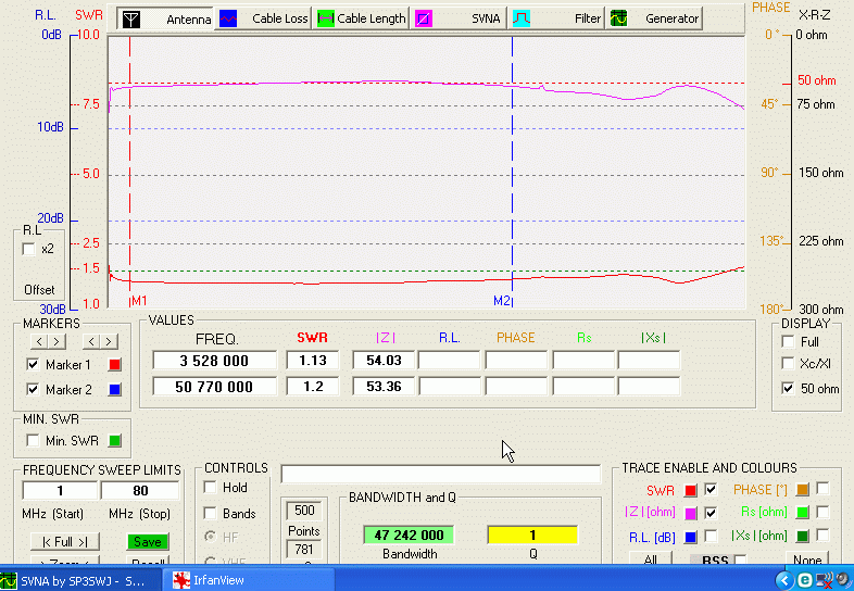 Zrzuty zdjęć transformatorów wejściowych, pomiar SWR - linia gdzie są znaczniki to kompensacja C- na wyjściu trafa -
