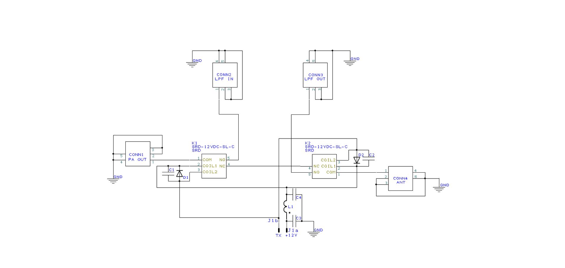 Załączam schemat płytki Auto/Manual z zintegrowanym obrotowym przełącznikiem 8 pozycyjnym. W pozycji 1 mamy opcję Auto. W pozycjach 2 - 8 opcja Manual. Taki sposób sterowania opcjami pozwala zrezygnować z przełącznika kołyskowego na płycie czołowej. W tym rozwiązaniu w opcji Auto przekaźniki są załączone i pobierają prąd, a w opcji Manual są w stanie spoczynku (bez poboru prądu). Jeżeli chcemy zrobić odwrotnie to zamieniamy funkcjonalność gniazd J2 i J3 na płytce. To znaczy, że do gniazda J2 przyłączamy przełącznik obrotowy, a do gniazda J3 wyjście band dekodera z płytki LPF. Tym razem w pozycji 1 (Auto) przełącznika obrotowego nie podajemy już z niego poziomu GND na wejście cewek przekaźników (złącze J4B), a piny gniazda J2 crosujemy z odpowiadającymi im cewkami przekaźników, na które ma trafiać GND. W ten sposób cewki zespołu przekaźników będą dostawać poziom GND w pozycjach 2-8 z przełącznika obrotowego (opcja Manual). Załączanie zespołu przekaźników zapewni taką komutację, że do złącza J1 trafiają na odpowiednie jego wejścia poziomy GND z przełącznika obrotowego.