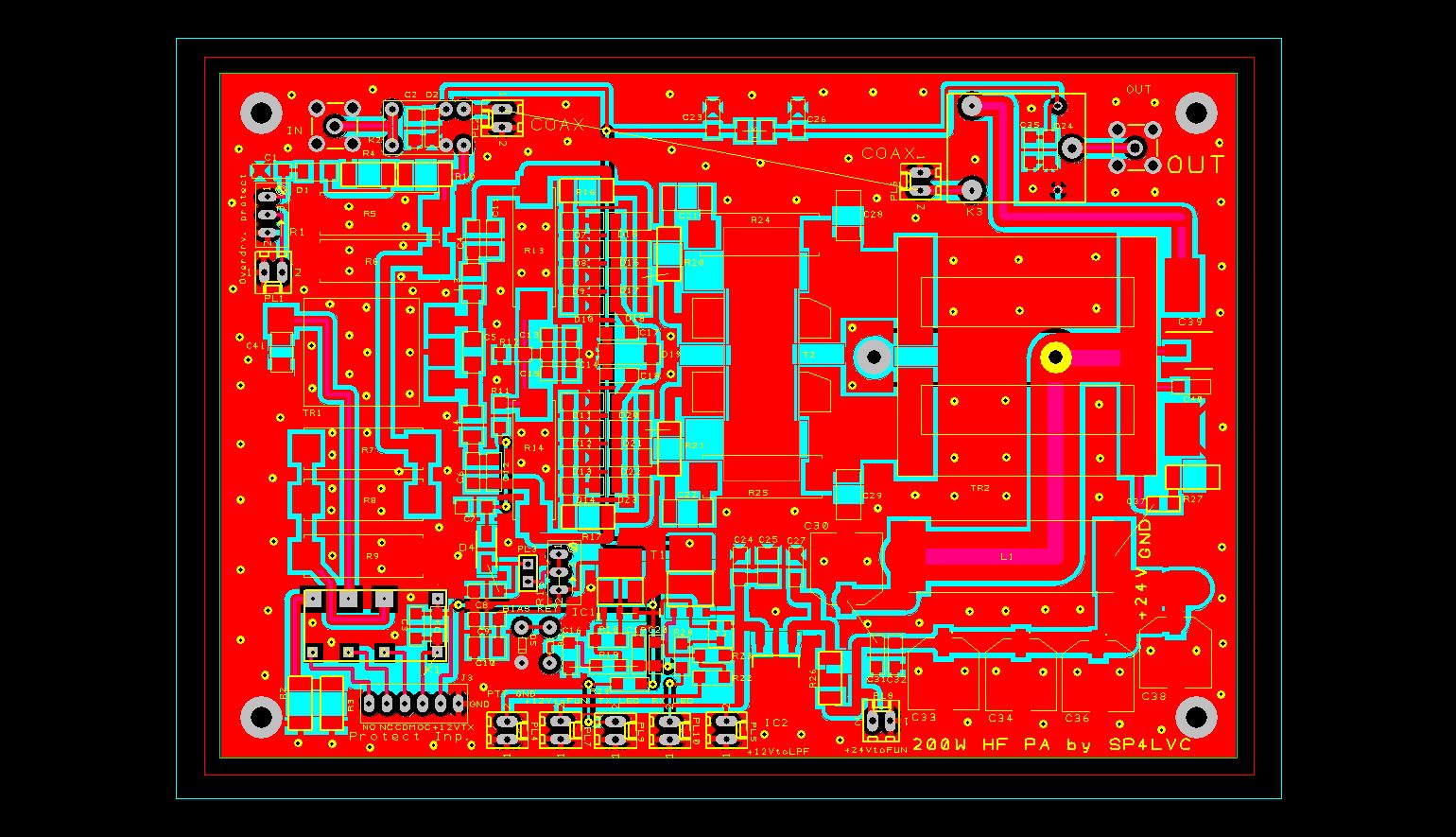 Do porannej kawy poprawiłem projekt płytki PA. Zawiera już wszystkie elementy z ostatniej wersji schematu i 2 gniazda CRIMP do wpięcia diód RX LED i TX LED. Proszę o wybaczenie, ale nie robiłem renumeracji elementów na schemacie i PCB, bo to dodatkowa robota i sprawdzanie, a ja powoli chcę mieć już pliki gotowe do złożenia zamówieniaw Chinach.