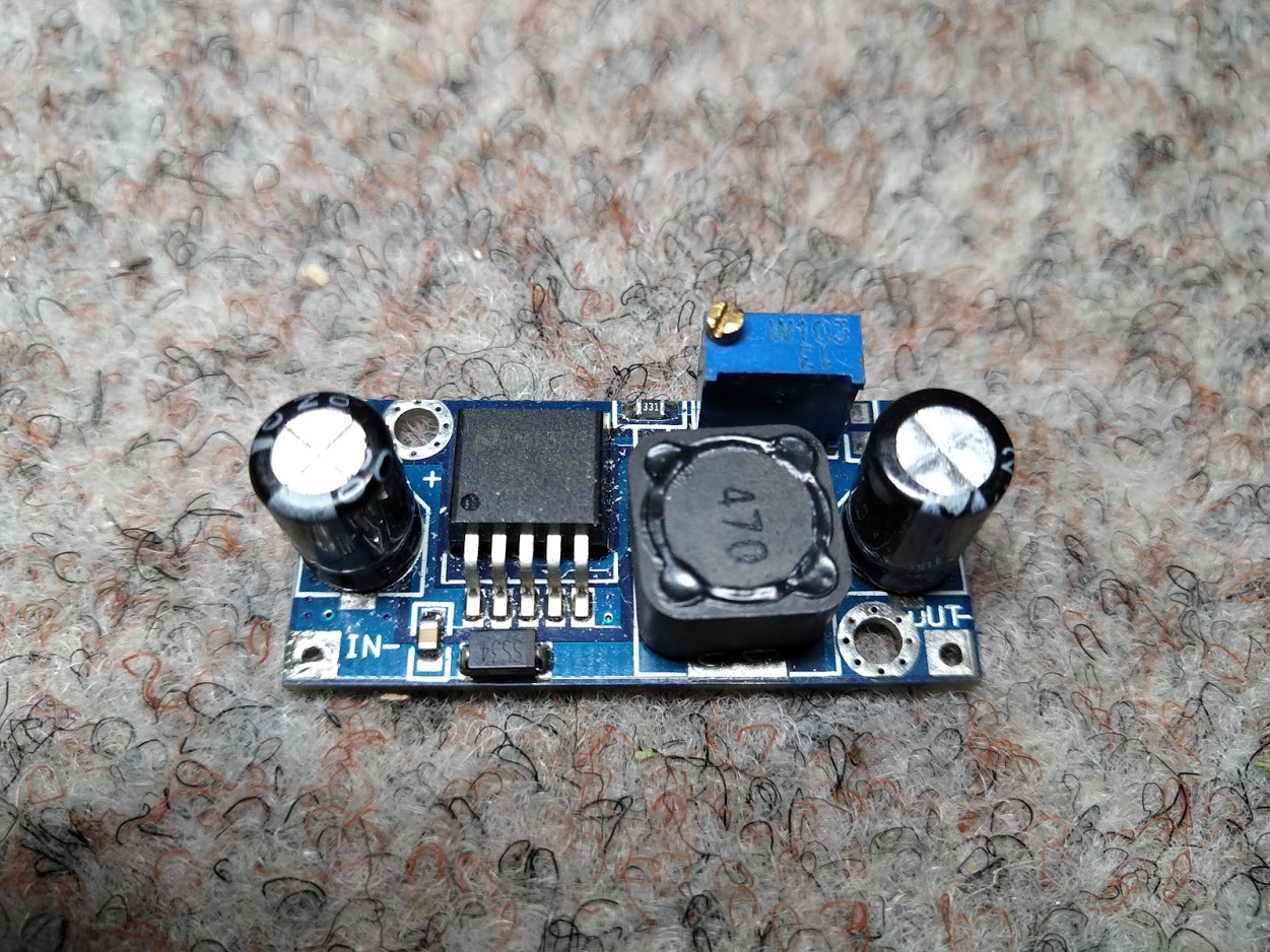 No i dzięki pomocy Macieja mamy sprawę załatwioną. Nawet okazało się, że mam coś takiego w szufladzie. Przetwornica Step Down na układzie LM2596. Wydajność do 3 A, małe gabaryty i najważniejsze, że ma możliwość przykręcenia na śrubkę.