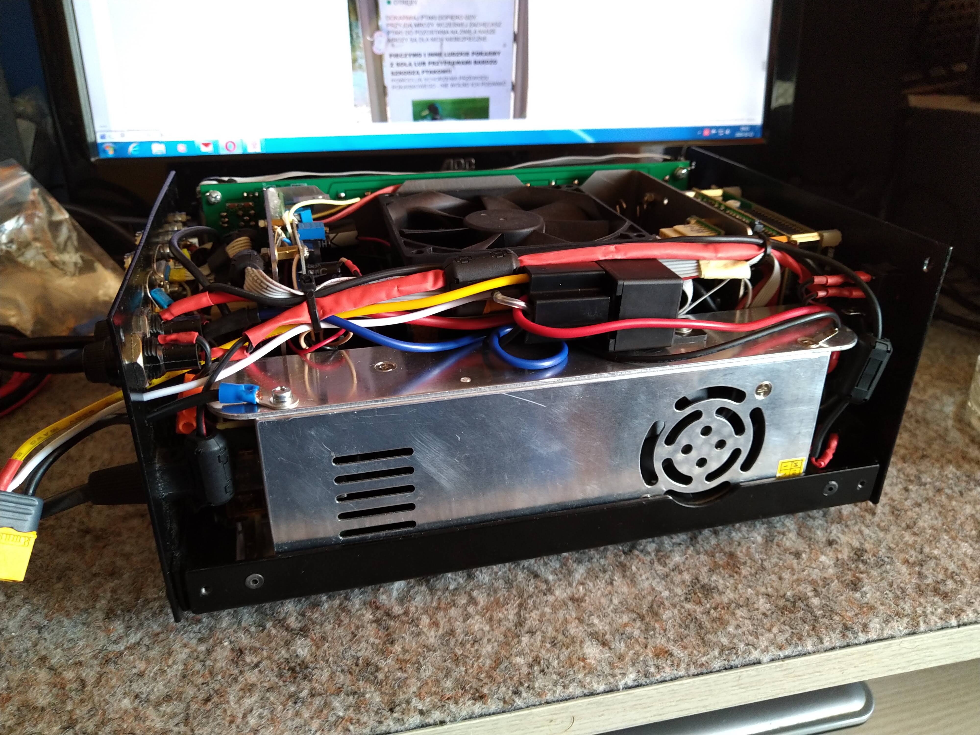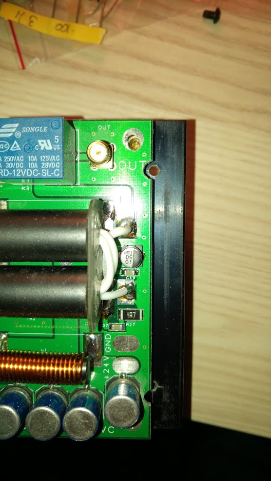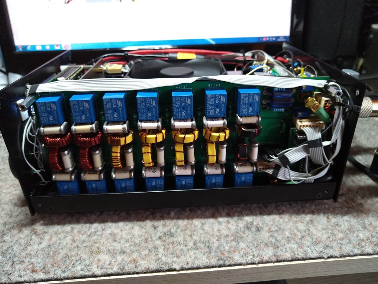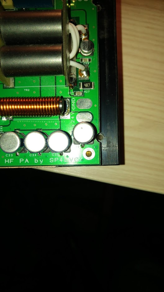 Przetwornica Step down 24/12V już założona. Działa jak trzeba. Wrzucam jeszcze fotkę bez pokrywy od strony płytki LPF. Poprawiona wersja pokrywy nie posiada już otworów do przykręcania górnych tulejek płytki LPF. Trzyma się ona wystarczająco mocno na tulejkach dolnych, przykręcanych do bocznej krawędzi podstawy obudowy. Połączenia koncentryczne w ciągu sygnału mocy robiłem wtykami SMA i kablem RG58, ale myślę, że RG174 też zdałby egzamin. U mnie RG174 jest założony jedynie na doprowadzenie sygnału z gniazda UC1 TRX do wejścia płytki wzmacniacza mocy. Tam idzie tylko kilkanaście watów, więc spokojnie starcza, a przy tym jest cieńszy i bardziej elastyczny niż RG58, który dałem trochę jakby na ,,wyrost" w pozostałej części połączeń. Z drugiej strony wolałem dmuchać na zimne, bo tam idzie w końcu 200W, a czasem ciut więcej. Jakby coś było niejasne to piszcie na PW lub mailowo. Mam mnóstwo zdjęć z budowy, które mogę udostępnić i postaram się odpowiedzieć na każde pytanie.