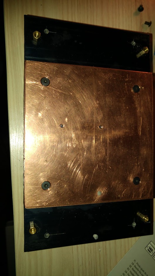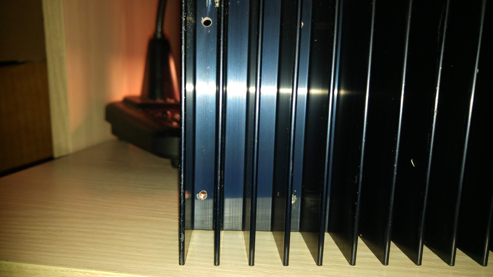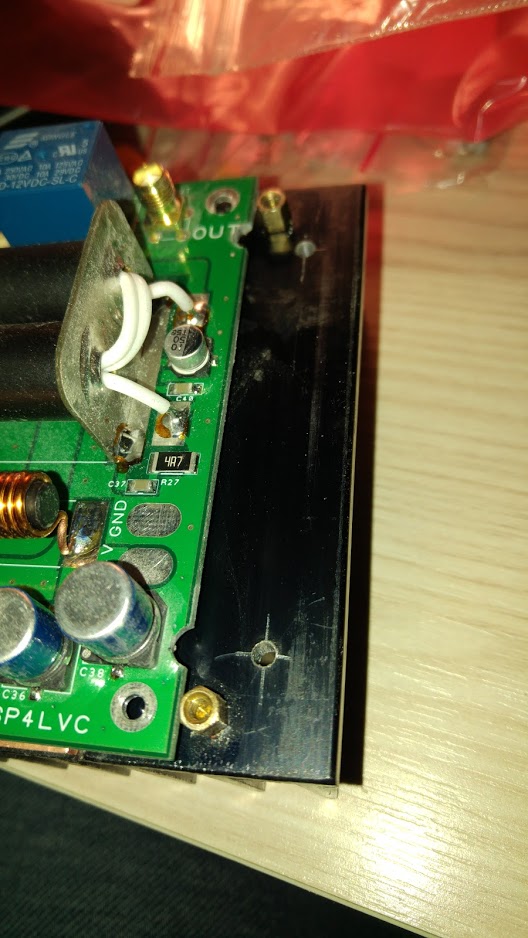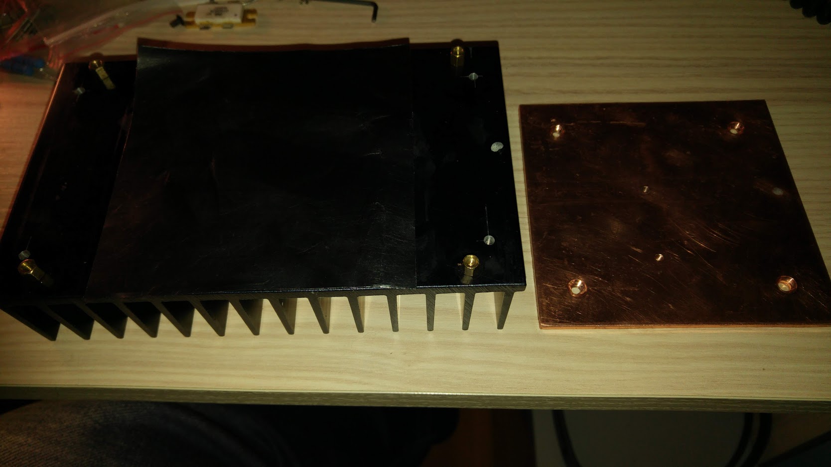 Wrzucam jeszcze kilka zdjęć, aby rozjaśnić sposób łączenia płytki PA i radiatora. W radiator są wkręcone tulejki dystansowe 5 mm i to do nich przykręcamy płytkę PA. Tulejki długie, na których ,,stoi" całość po jej odwróceniu do góry nogami są wkręcone w dodatkowe otwory radiatora widoczne na zdjęciach.