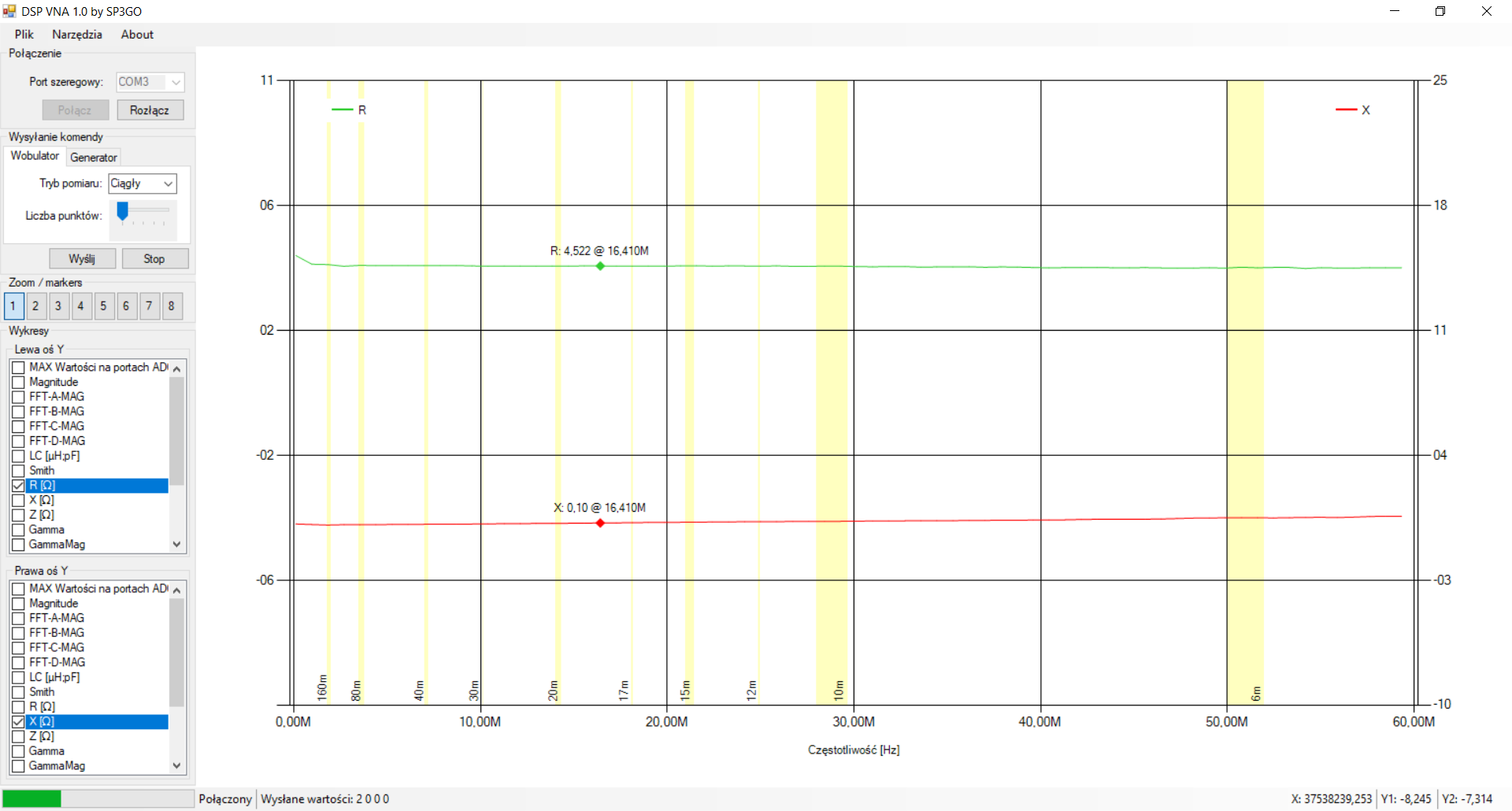 Podobnie jak poprzednio, pokazuję pomiary rezystancji (skala na lewej osi) oraz reaktancji (skala na prawej osi).