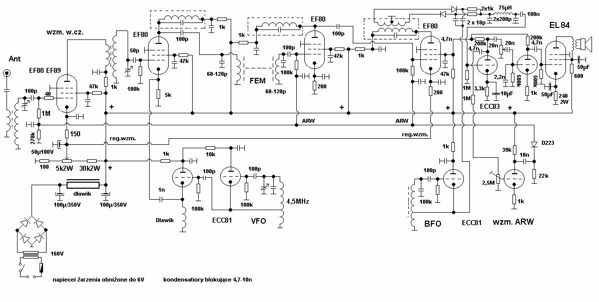 6 Na pewno wzmacniacz m.cz. można wykonać na lampie ECL redukująć jedna z triod a generator BFO na triodzie lampy ECF redukująć druga triodę co w sumie pozwoli na eleiminację jednej z lamp ECC.