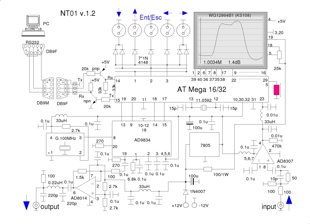 W nowej wersji użyłem tylko jednego mikroprocesora (Mega16 lub 32). Odpadła konieczność przesyłania danych pomiędzy układem pomiaru a układem wizualizacji wyniku. Dało to od razu duże korzyści. Czułość urządzenia wzrosła do ponad 80dB a prędkość pracy (wyświetlanie wykresu) jest komfortowa bo zmiany są widoczne niezwłocznie po wprowadzeniu w układzie.