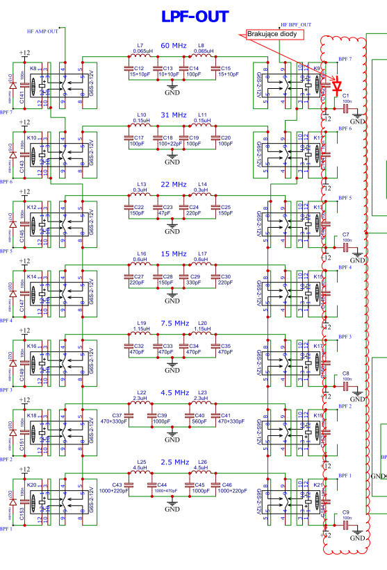 Mianowicie nie ma diod gaszących przy przekaźnikach prawej gałęzi układu filtrów LPF-OUT - dotyczy przekaźników K9, K11, K13, K15, K17, K19 i K21.