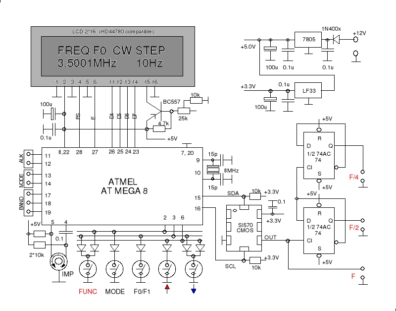 Kilka dni temu wróciłem do syntezy na SI570. Mój układ jest w wersji CMOS a pełny schemat załączam. Układ jest zmontowany ale na razie uruchomiłem połączenie z układem oraz ustawienie częstotliwości za pomocą impulsatora. Udało mi się tak oprogramować impulsator, że nawet taki za 5 PLN działa poprawnie nie gubiąc i nie dodając od siebie impulsów. Z tego kawałka jestem naprawdę zadowolony, nigdy nie osiągnąłem tak dobrego wyniku. Częstotliwość mogę zmieniać z krokiem wybranym za pomocą klawiszy rotujących krok zmiany w obu kierunkach z granulacją 10, 100, 1k, 10k, 100k i 1MHz. Wyjście obserwuję za dzielnikiem na 7474 bo mój miernik działa do ok. 25MHz co pozwala pomierzyć sygnały mniej więcej do 100MHz. Generator działa mniej więcej od 3.460MHz. Zabieram się za dalsze programowanie i zamierzam wbudować następujące funkcje: