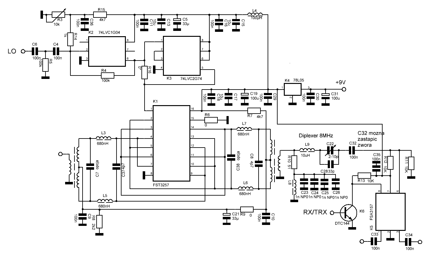 Jeszcze jedno rozwiązanie mieszacza do Blue. Sam mieszacz jest kopią rozwiązania z K3. Jest to mieszacz pierścieniowy ale wykonany na bramkach. Klucze są połączone równolegle co zmniejsza rezystancję w stanie włączenia (ale zwiększa pojemność). Elementy polaryzacji bramki lvc1g04 są potrzebne gdy nie stosujemy dzielnika częstotliwości przez 2. W tym wypadu montujemy rezystor R16 -0m. Jeśli montujemy dzielnik przez 2, R16 nie montujemy. Zastosowania dzielnika częstotliwości wymaga podwojonej częstotliwości heterodyny, odpowiedni program posiada Piotr SP9LVZ. Zaletą zastosowania dzielnika jest bardzo dobra symetria w całym zakresie częstotliwości co powoduje zmniejszenie niepożądanych produktów mieszania. Niepożądane produkty mieszania zmniejszają też cewki 680nH i kondensatory 4p7. Tranzystor DTC144 zawiera zintegrowane w sobie rezystory ograniczające prąd bazy, tzw tranzystor cyfrowy. Zamiast przekaźnika mechanicznego do przełączania sygnałów IF/ TX zastosowano przełącznik elektroniczny FSA3157. Diplekser jest typowy. Mój schemat, pcb, uruchomienie Piotr SP9LVZ (czyli czarna robota -dziękuję) Wink. Piotr właśnie układ testuje. Wyniki myślę, że są dobre Wink
