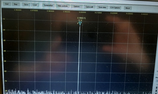 Zdjęcie obrazu sygnału p.cz. 9 Mhz przy zadaniu sygnału na wejście mieszacza S9+60dB 3.580 Mhz.