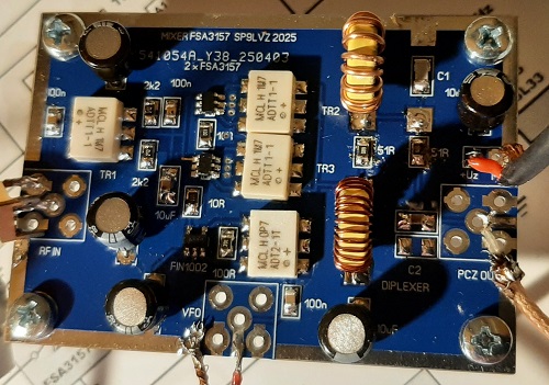 Jeśli chodzi o ten prezentowany mieszacz na FSA3157, to ma on na wyjściu diplexer, wartości indukcyjności i pojemności wg. schematu. Czyli od strony p.cz. ma zamknięcie dla pochłaniania odbić. Na dodatek jest on podłączony do płytki p.cz. B-L-U, która ma na wejściu obwód rezonansowy i mosfet, a nie jest włączony wprost na filtr kwarcowy. To jest też element minimalizacji odbić sygnałów. W przypadku podłączania mieszacza wprost na filtr kwarcowy (uwzględniając oczywiście jakiś element dopasowania) mamy największy problem w tym zakresie bo filtr odbija wszystko poza jego zakresem przenoszenia.