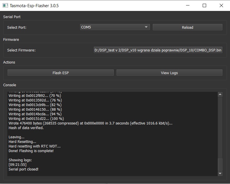 4. Naciskamy Flash ESP. Na konsoli widzimy postęp wgrywania programu. Wgranie kończy się komunikatem wgrania programu i zamknięcia portu COM.
