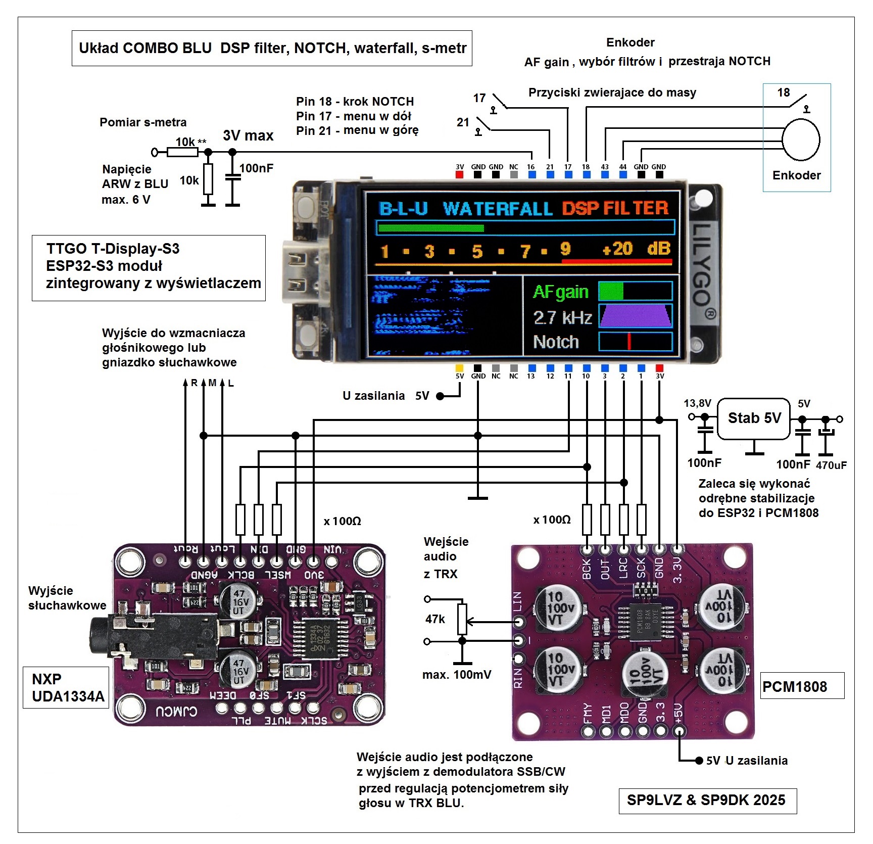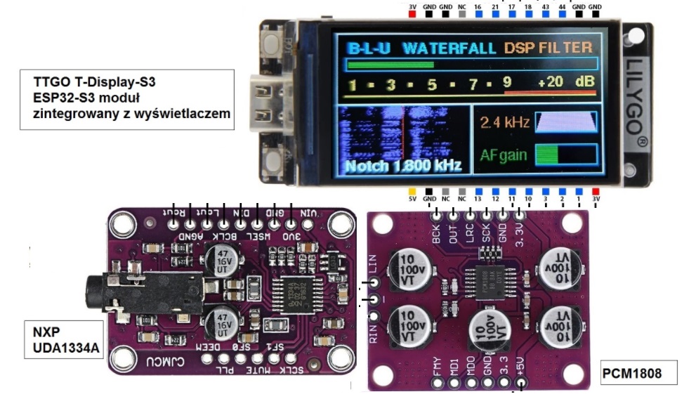 Transceiver SDR jest realizowany na tych samych modułach co COMBO DSP: ESP32-S3T, przetworniki ADC PCM1808, DAC UDA1334A.