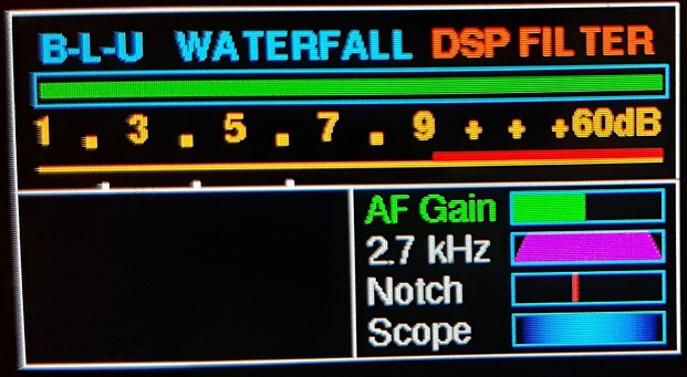 W menu zostało dodane pole Notch, zaś przyciski oferują teraz zmianę pozycji w górę i w dół ułatwiając wybór funkcji. Poziom AF gain, szerokość filtra i zmiana częstotliwości Notch ustawiane są enkoderem. Krok strojenia Notch obsługuje przycisk enkodera. Waterfall sygnału odbieranego został kolorystycznie zróżnicowany z niebieskiego do koloru "lodowatego" dla silniejszych sygnałów.
