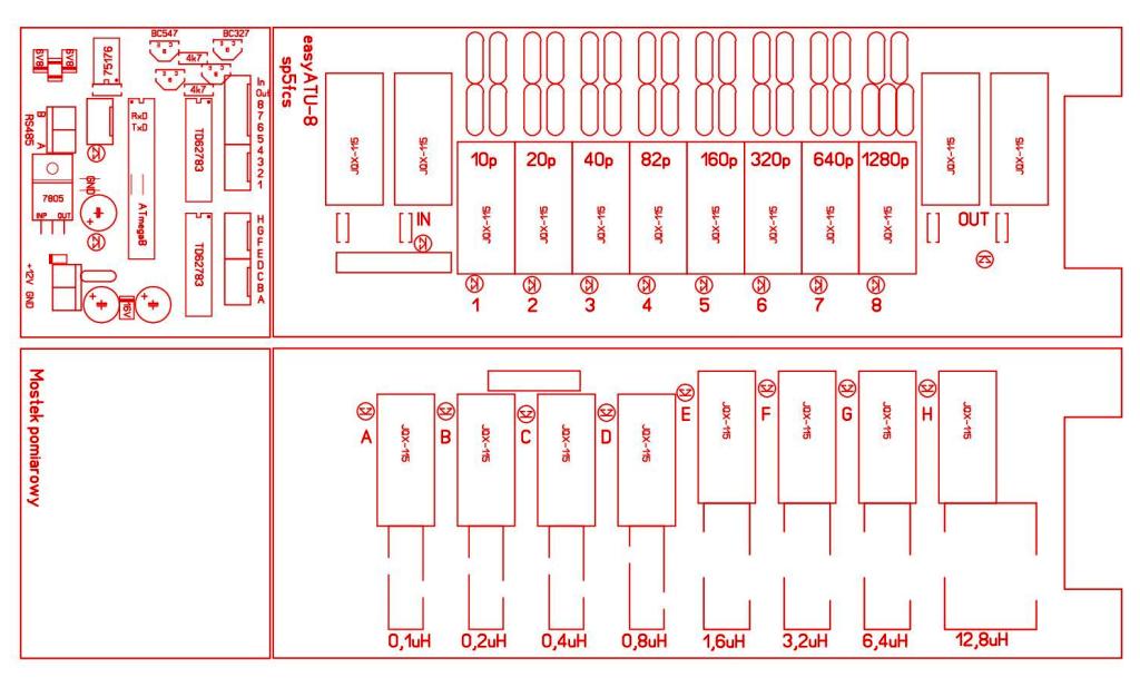 Wolny poligon na płytce indukcyjności to miejsce na mostek pomiarowy. Możemy go wrysować w wolne miejsce lub dostawić jako autonomiczny moduł pomiarowy (padająca, odbita). Tak samo wykonany jest procesor skrzynki, możemy oddzielić go od płytki nastawnika pojemności w jego miejsce dać inny model np. ATmega32. Połączenie kabelkami pomiędzy procesorem a przekaźnikami może nie wygląda super ale upraszcza druk i pozwala na podpinanie innych modułów procesora.