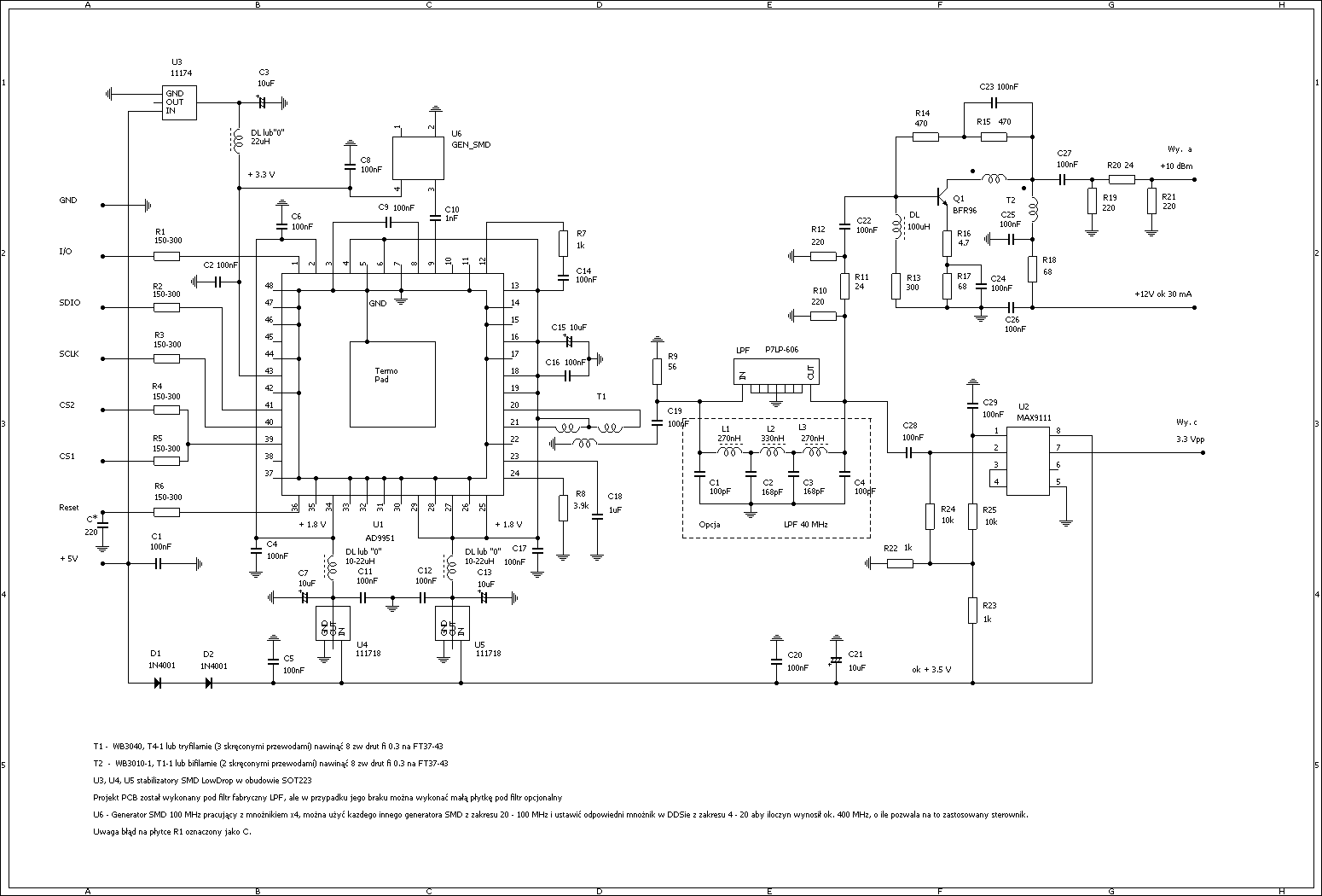 ja podejrzewam jedno-na wyj ad9951 jest sinus i nie wiem czy nie zastosowac jakis bramek dla zrobienia prostokata? przyznam ze probowalem roznych opcji na 74f04 na nand ,nor i zawsze to samo jezeli chodzi o pasmo 28mhz ,,na si570 o dziwo działało czyli 74f02 pracowal przy 120mhz,,wogole jak ruszam przewodem ktory laczy ddsa i plytke piligrima ,a jest to pare centymetrow przewodu ekranowego to tak jakby sie cos wzbudzalo,,cos z wyj. ddsa jest chyba nie tak,,jest to wersja smd,,zaznaczam ze dziala cat i program pod usb i o dziwo pod usb mam pasmo 28mhz ale tam jest level w programie do ustawienia ponad 100procent i wtedy chodzi a na rownym 100 nie dziala juz ,,a w menu rd3ay w lcd jest do 100procent ,,moze napiecie wyj, z ddsa jest za małe?
