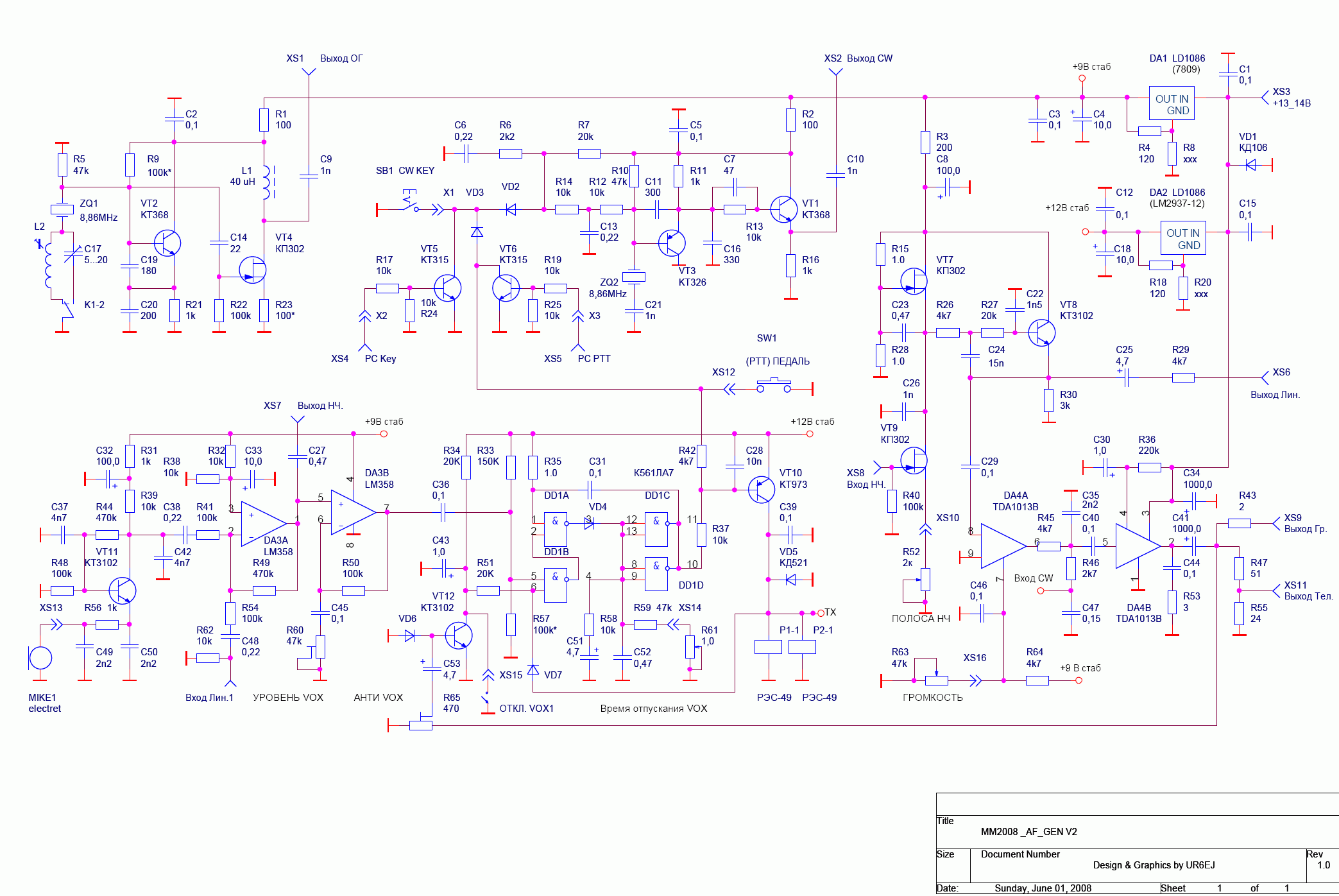 - Mieszacz odbiornika wykorzystany przy nadawaniu jako modulator jest istotą genialności pomysłu MiniYesa. Na 100% wykorzystaniu wszystkich dostępnych bloków układu TCA440 zarówno przy nadawaniu jak i przy odbiorze właśnie istota tego geniuszu polega. Dzięki temu w konstrukcji zawierającej minimum elementów osiągnięto maximum efektów - nie ma innej konstrukcji amatorskiej na jednej płytce, która ma tyle funkcji i tak dobre parametry przy swej prostocie: szybki kompresor, ALC, wysoka czułość odbiornika ( 0,1uV) przy jednocześnie wysokim IP3 (+30dBm), S-metr, ARW z przełączaną stałą czasową, bardzo duży zakres działania ARW ( ponad 110dB).