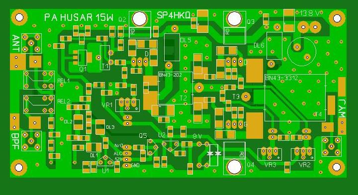 Prace nad wzmacniaczem mocy 15W do projektu HUSAR zostały zakończone. Wersja wzmacniacza na płytce prototypowej przy napięciu 13.5V osiągnęła moc 15 W. Natomiast przy napięciu zasilania 18.5V (z zasilacza od laptopa) osiąga moc 25W (przy odrobinę wyższym sterowaniu). Została tez zaprojektowana płytka PCB. W załączeniu zdjęcie płytki w wersji prototypowej na której wykonywano próby, obraz PCB i ostateczny schemat.