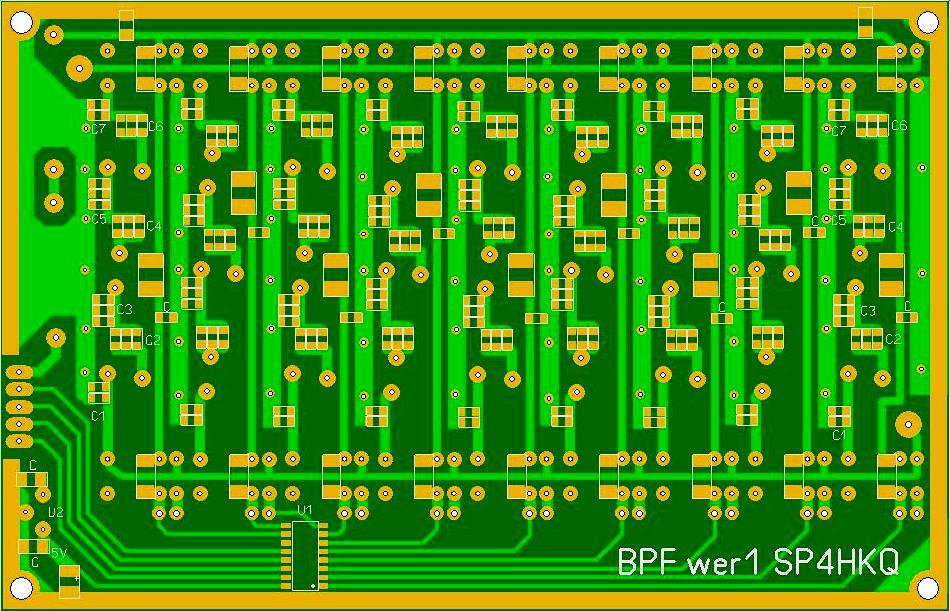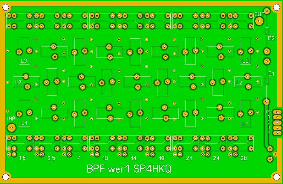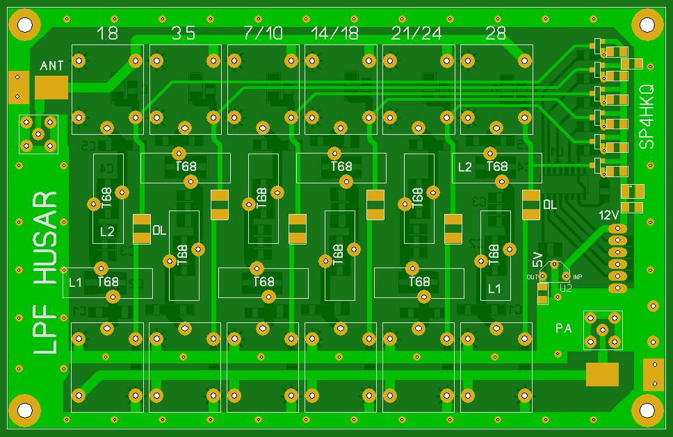 Po płytce wzmacniacza przyszła kolej na LPFy. Zaprojektowano płytkę PCB. Do przełączania pasm zostały użyte przekaźniki 12V JZC-6F sterowane z SN74LS145 przez klucze tranzystorowe PNP. W załączeniu widok płytki i pliki symulacyjne z RFSIMa.