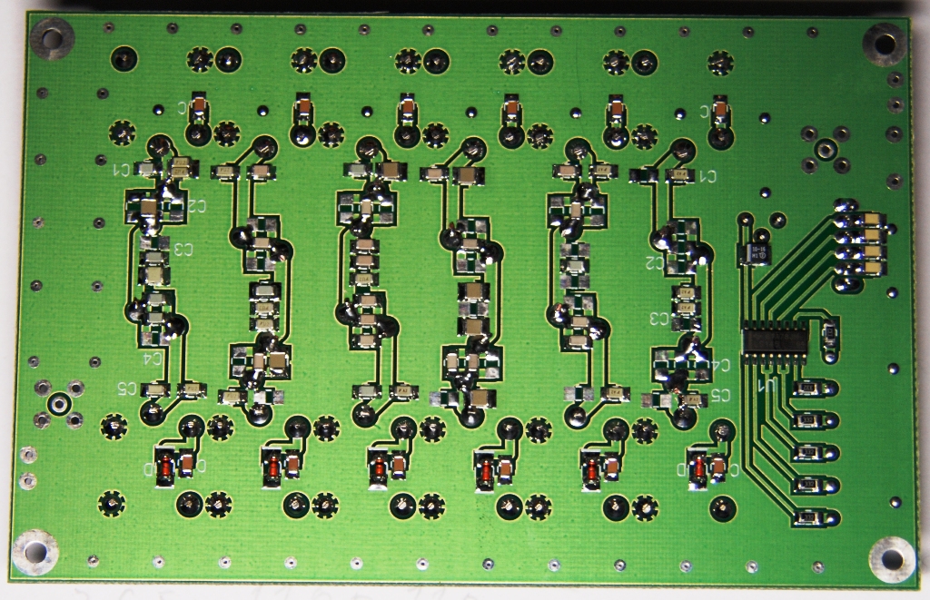 Większość kondensatorów ma na druku po trzy pola SMD do składania różnych wartości, na wejściu i wyjściu trzeba składać kondensatory piętrowo na "kanapkę".
