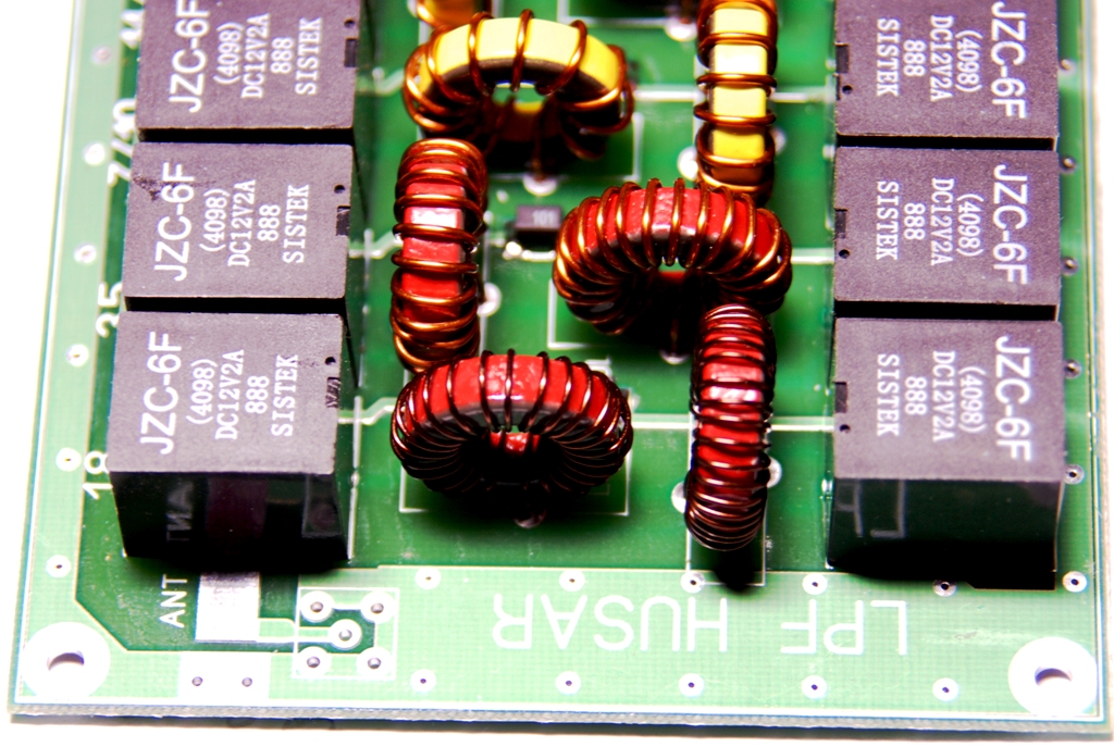 Uniwersalny moduł filtrów dolnoprzepustowych LPF do Husara wykonany na płytce fabrycznej. Wymiary modułu 90x140mm, przekaźniki w popularnej obudowie identycznej jak w filtrach LPF do Picastara oraz Combo, rdzenie od T50 do T80 w zależności od mocy PA, kondensatory SMD CG0 500V. Moje filtry wykonałem na rdzeniach T68, drut 0,9mm oraz 0,6mm dla 160m.