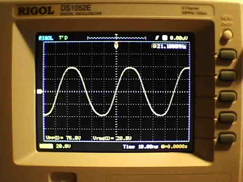 Na wejście wzmacniacza podaję sygnał z NWT500. Jego sinusoida na "oko" jest idealna i FTT to potwierdza(prawie 40 dB odstęp). Do wyjścia wzmacniacza podłączyłem opornik 32-7037 50 Om 250 W pracujący w zakresie DC-2.7GHz. A przebiegi zdejmuję bezpośrednio z wyjścia wzmacniacza sondą GE1521 (150 MHz, 12pF 10 MOm). Zauważcie panowie, że pomiary są robione na biurku, wkoło przydługie druty i umasienie wzmacniacza pozostawia wiele do życzenia. Zmiana sondy z chińskiej na niemiecką też o dziwo poprawiło przebieg. Dobre wyniki będą gdy go włożę w obudowę, za ekranuję i prawidłowo zasilę, bo nie wiadomo gdzie to wcz włazi. Jak do tej pory to wzmacniacze robi wielu kolegów, ale jakoś nikt nie pokazuje co im wychodzi bezpośrednio ze wzmacniacza. Inna sprawa to zdejmijcie obudowy ze swoich fabrycznych urządzeń i zobaczcie jak wygląda przebieg przed LPF. Trzy strony wcześniej były wykresy zdjęte z prototypu wzmacniacza HUSAR. Można porównać jak się zmieniły. Dodanie LPF "wyrówna" każdą sinusoidę, a w tym wypadku uważam, że stanie się to bez straty mocy wyjściowej wzmacniacza.