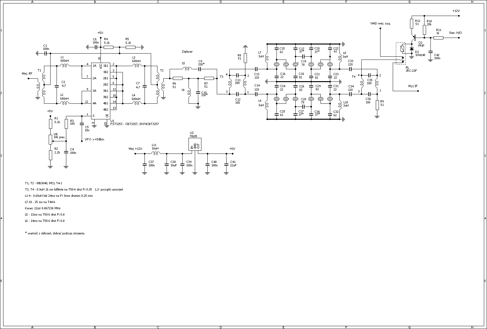 Schemat samego diplexera jest dokladnie taki sam jak w trx HUSAR, dodalem schemat z wartosciami elementow. Oczywiscie kondensatory mozna wybrac najblizsze z typoszeregu korygujac nieco wartosci cewek.