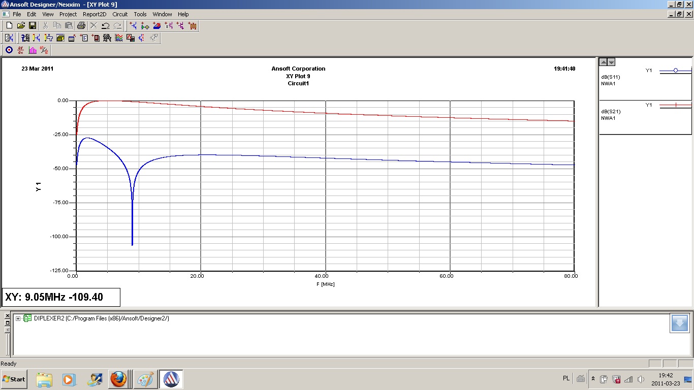 Nasz filtr w diplekserze musi tłumić znacznie więcej, co najmniej 20dB, z tąd rzeczywista realna szerokość pasma jego działania zaczyna się dopiero od około 1MHz.