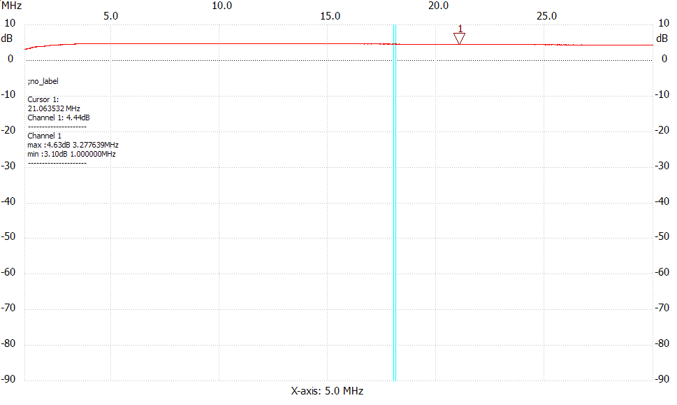 Tu linie prosta w zakresie KF, ale czemu jest kilka dB powyzej linii 0dB? Nie powinno byc dokladnie wzdluz linii 0dB?